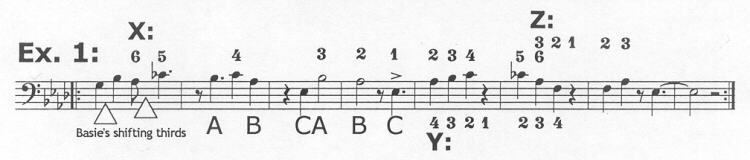 first motif (the minor third) of Basie's part B a half-step up is cited